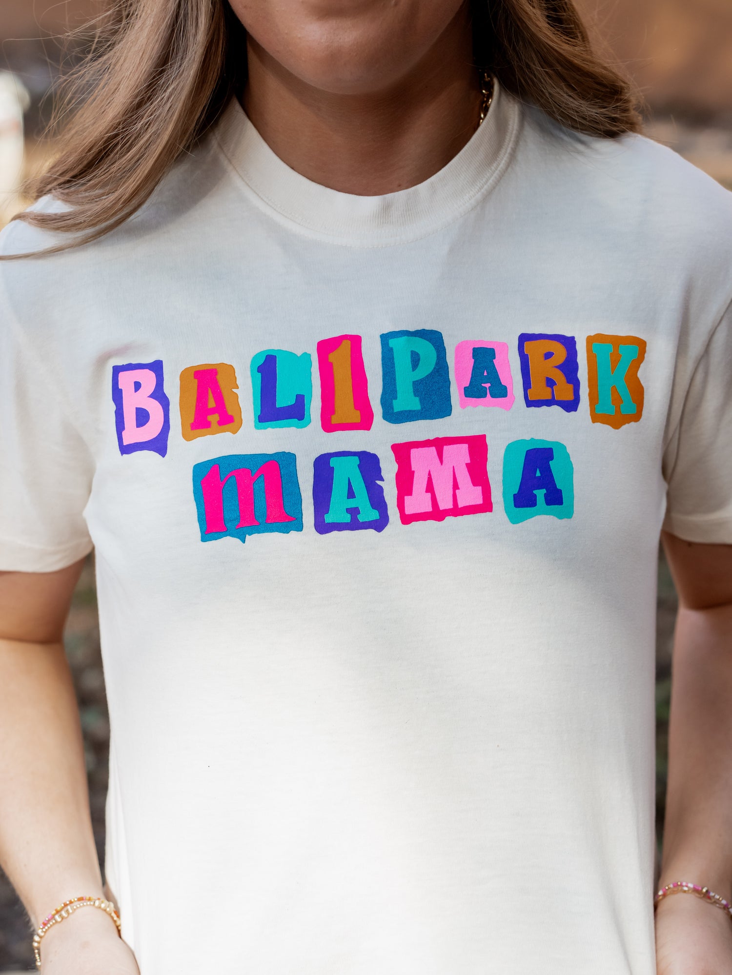 - Colorful scrapbook-style "Ballpark Mama" design
