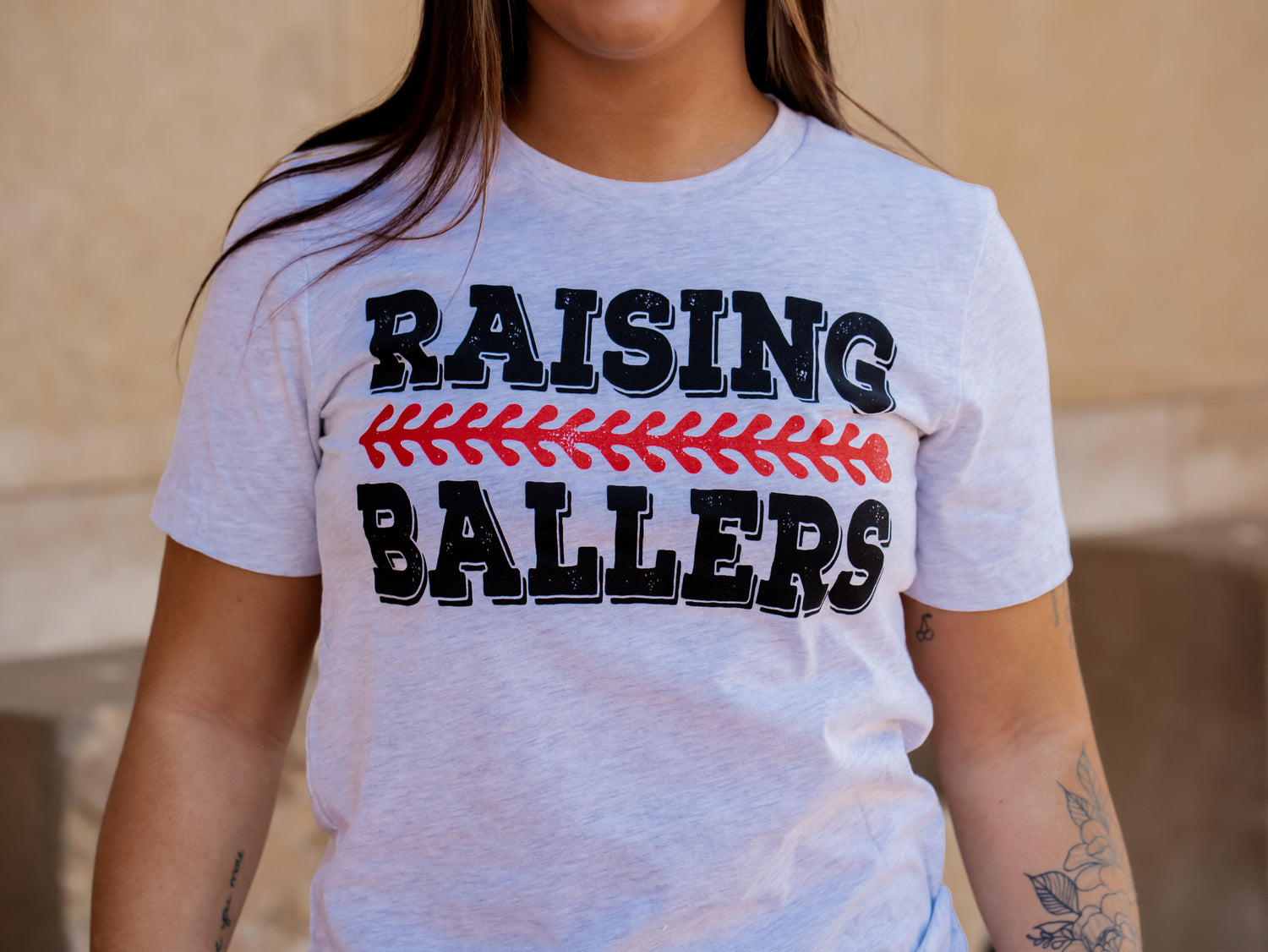 Celebrate the journey of raising your little athletes with our Raising Ballers Baseball/Softball Tee! This ash gray tee features a bold design with crossed baseball bats and the phrase "Raising Ballers" in classic red, white, and black. Perfect for proud baseball and softball parents who spend their days at the ballpark cheering on their players, this comfortable tee is your new game day essential.